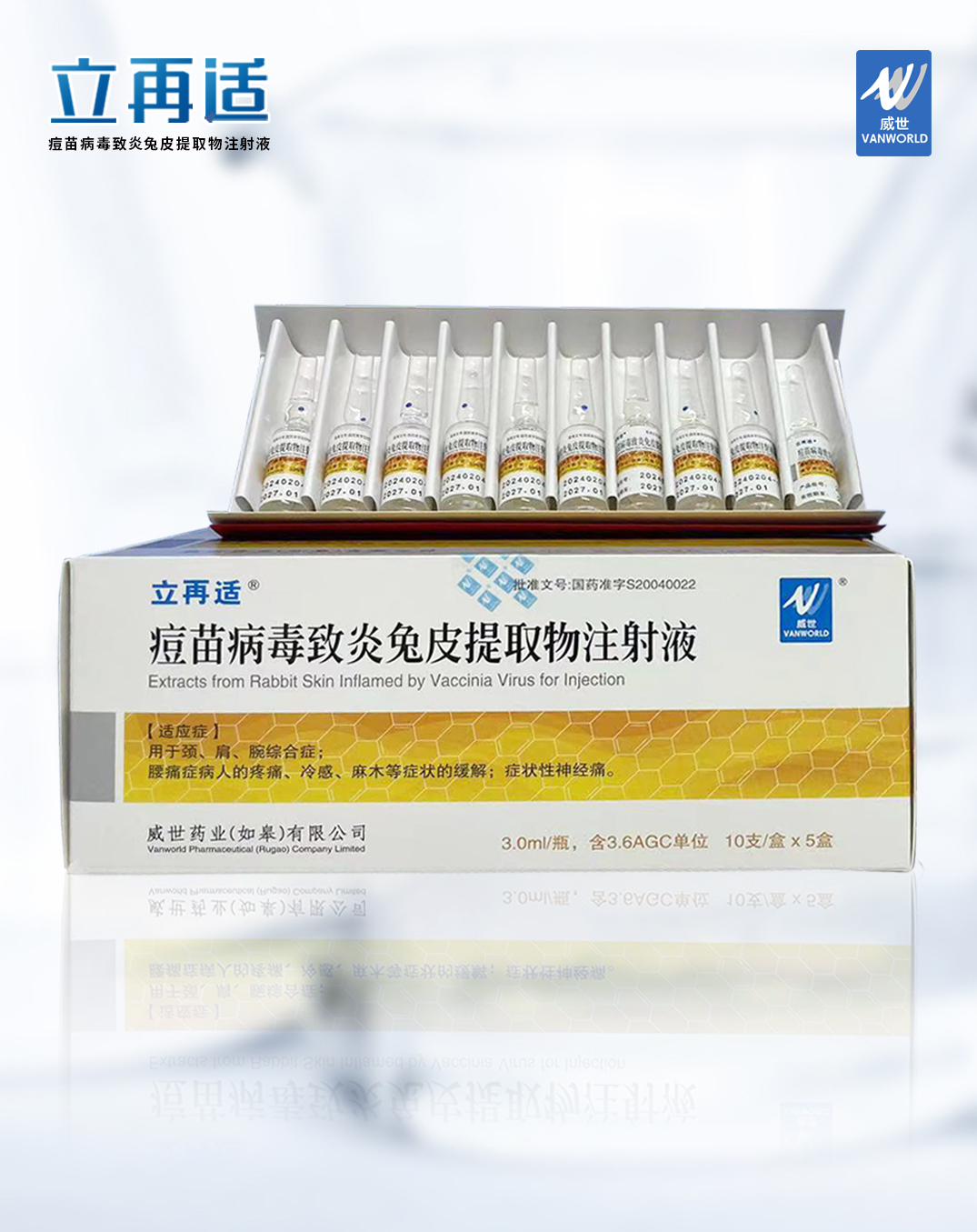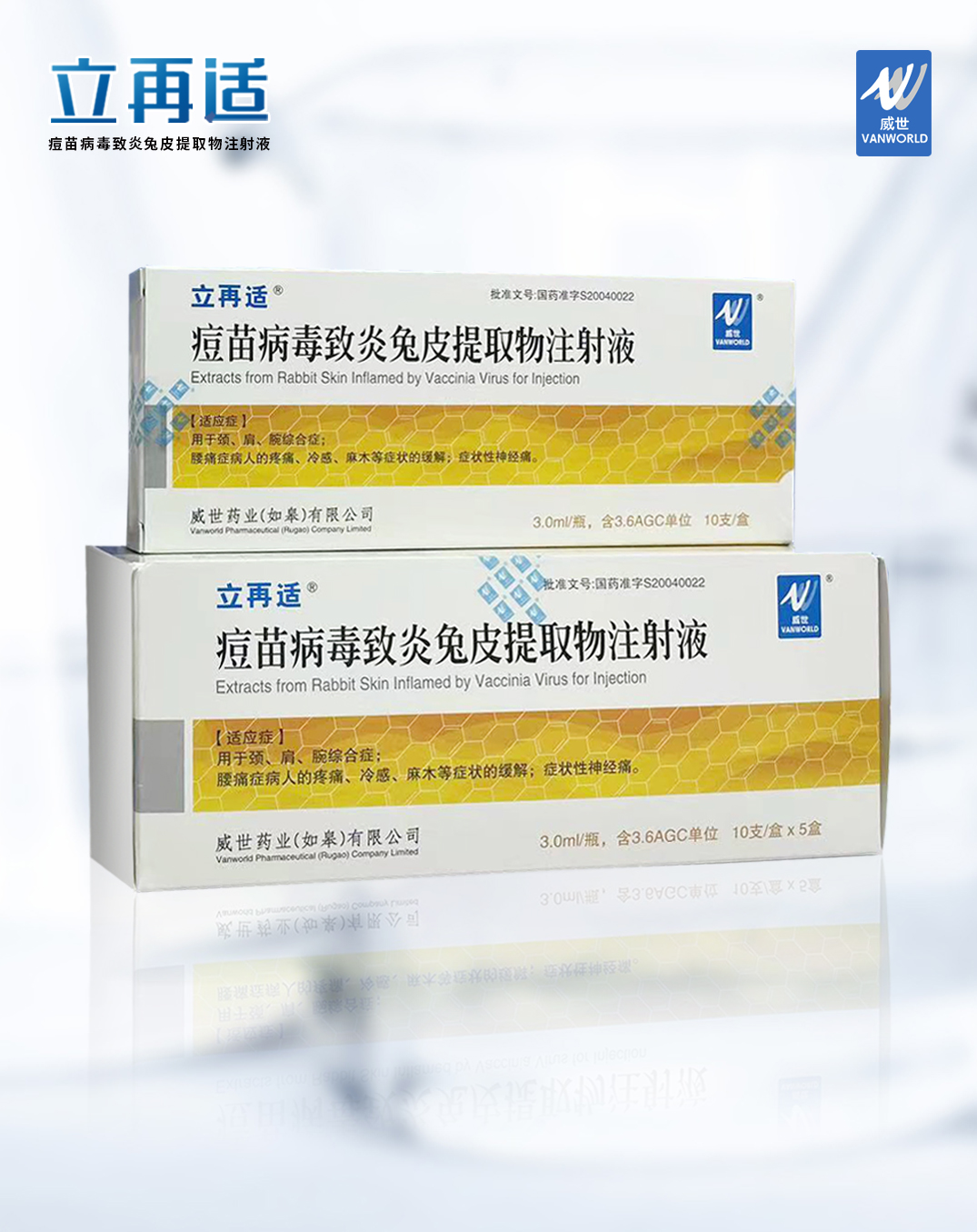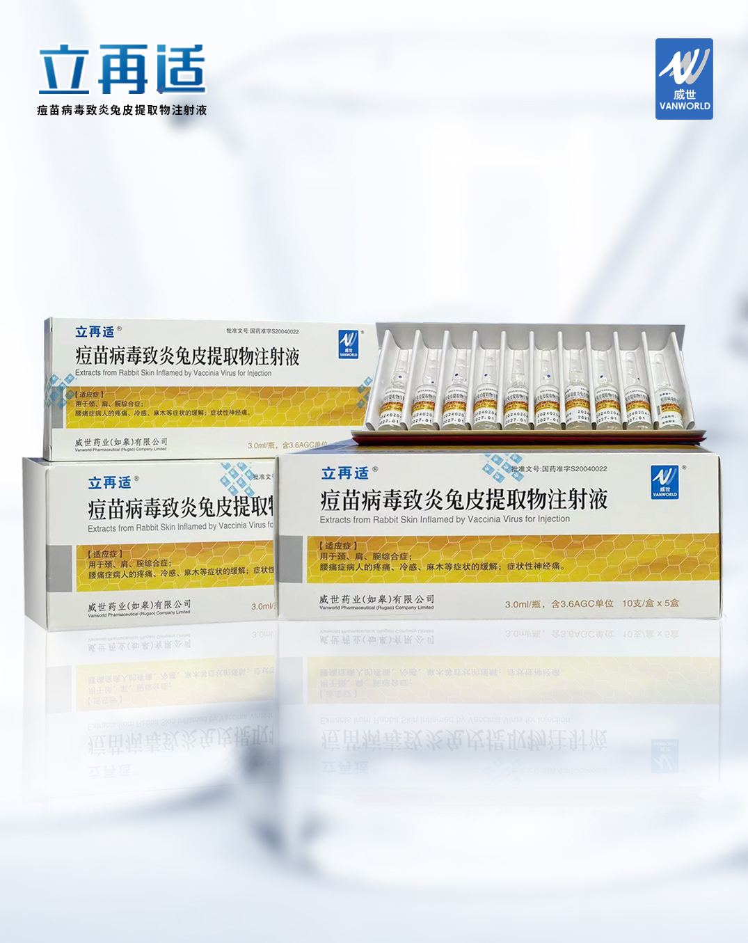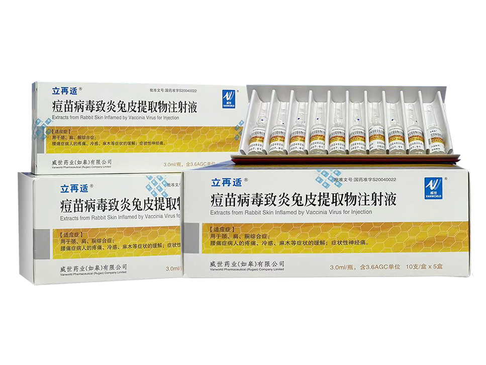 "Extracts from rabbit skin inflamed by vaccine virus for injection" is a therapeutic biological product produced by Vanworld Pharmaceutical (Rugao) Company Limited. It was approved by the State Food and Drug Administration (CFDA) (gyzz s20040022) in 2004 and began to be produced and sold in China. Clinically, it is mainly used for the treatment of "neck, shoulder and wrist syndrome; relief of pain, cold sensation, numbness and other symptoms of patients with low back pain; symptomatic neuralgia".